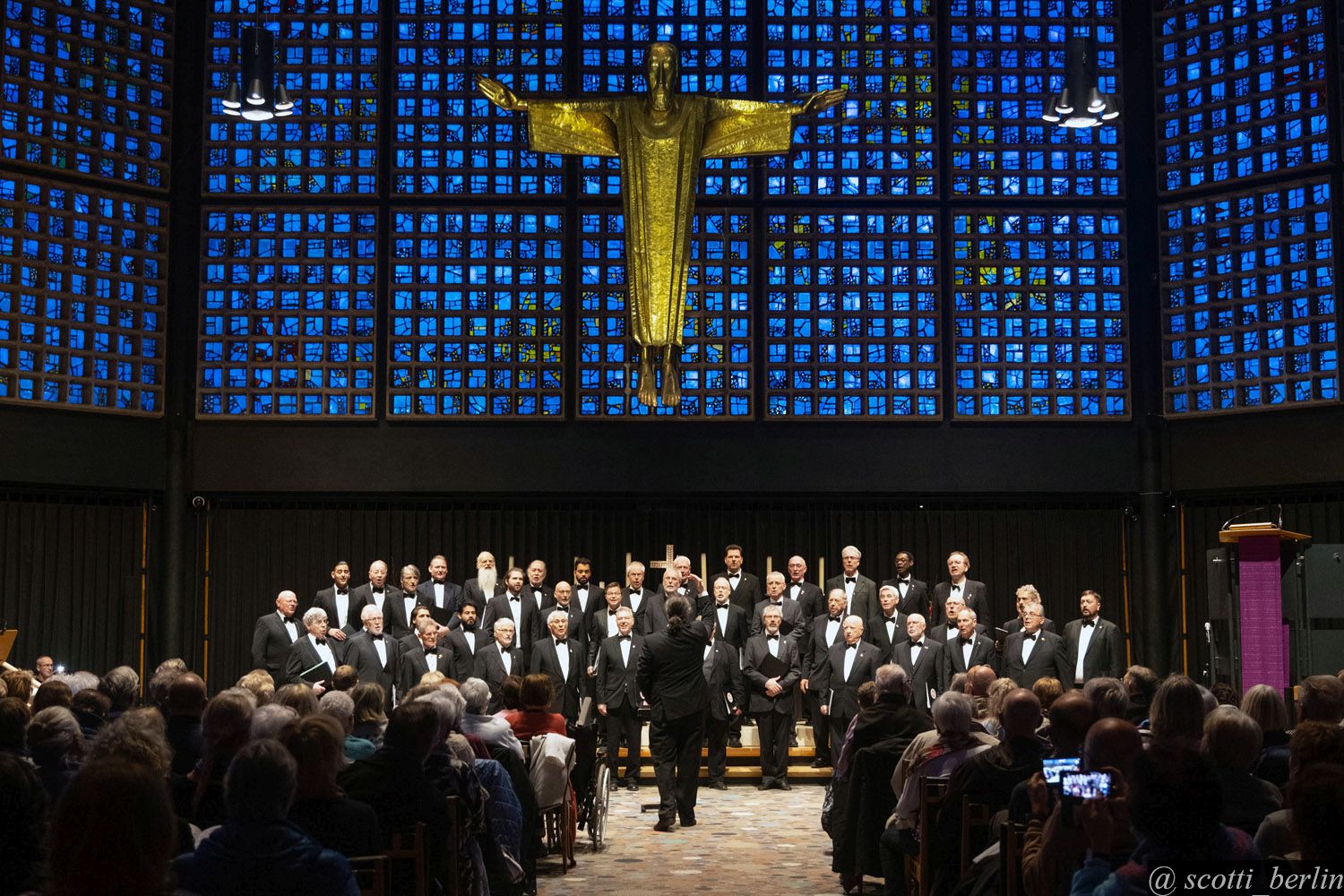 Schon bei den ersten Klängen der Alphörner zeigte sich, dass die Kaiser-Wilhelm-Gedächtniskirche wie geschaffen war für dieses Instrument. Der Auftakt jedoch gehörte dem Männerchor. Mit ihrem im Hintergrund des abgedunkelten Kirchenraums vorgetragenen „In Nacht und Dunkel“ (von A. Thoma) wurde eine feierliche, ja fast meditative Stimmung erzeugt. Hiernach erschallten die Alphörner und der Andachtsjodler der Sänger. Weitere Weihnachtslieder ertönten. Mit dem Gospel „Whisper, whisper“ verließ der Chor die Alpen um anschließend in Kenia zu landen und gemeinsam mit den Bläsern das „Eyenga mbotama“ (übersetzt: Am Weihnachtstag) vorzutragen.