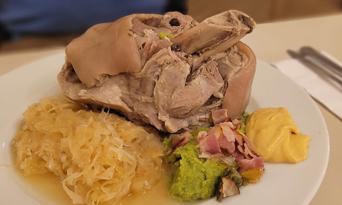 Schließlich hieß es dann: es ist angerichtet! Und schon „stürmten“ über 60 Männer zur Ausgabestelle um ein Eisbein oder eine Haxe abzuholen. Doch halt: es gab auch 1 (!) vegetarisches Gericht nämlich für unseren Bernhard aus dem 1. Tenor.
