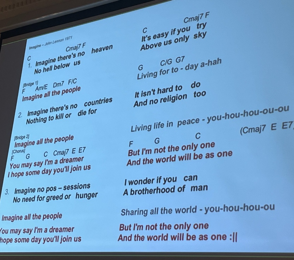 Und dann war das Publikum gefragt! Die Leinwand war heruntergefahren und von einem Beamer die Liedtexte produziert, so das alle mitsingen konnten, z. B. Songs von ABBA, den Beatles und Robbie Williams. Es ertönten „Country Roads“ (John Denver), „Major Tom (Peter Schilling), „Du hast den Farbfilm vergessen“ (Nina Hagen), und, und, und...
