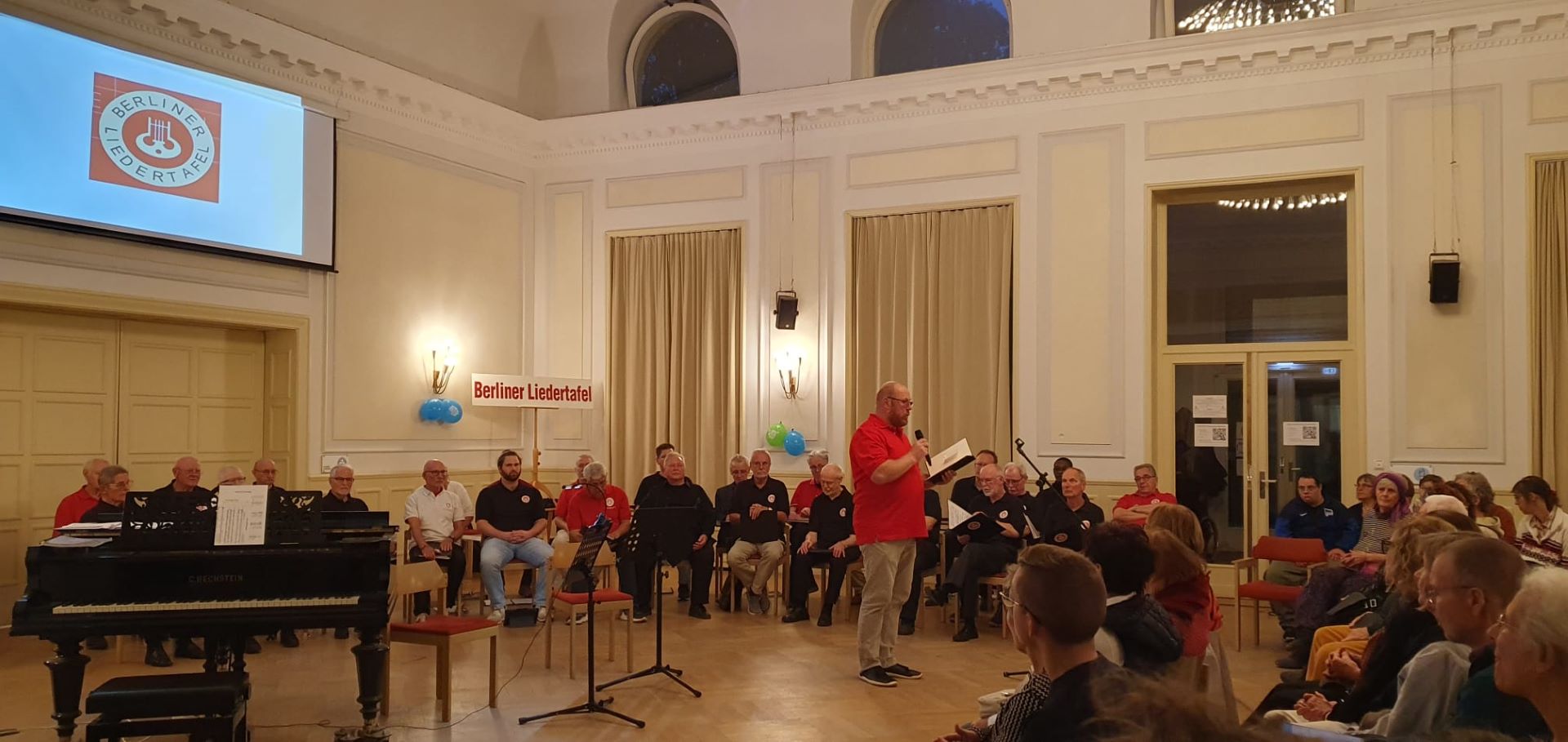 Gegen 18.30 Uhr stimmte die Berliner Liedertafel die rund 100 Anwesenden mit eigenen dargebrachten Liedern auf das gemeinsame Konzert ein und zwar mit der „Hymne“ von E.N. Mehul, ein Lied aus der Zeit der Französischen Revolution. Wenig später ertönte „Freiheit“ von Marius Müller-Westernhagen.