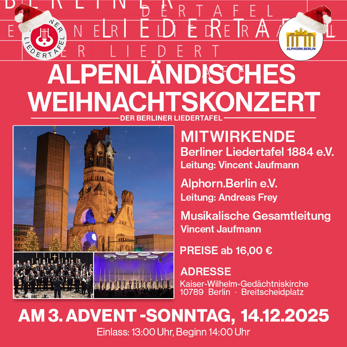 Tauchen Sie ein in die festliche Atmosphäre der Adventszeit und genießen Sie das stimmungsvolle Adventskonzert der Berliner Liedertafel 1884 e.V. und Alphorn.Berlin e.V. in der geschichtsträchtigen Kulisse der Kaiser-Wilhelm-Gedächtniskirche.
